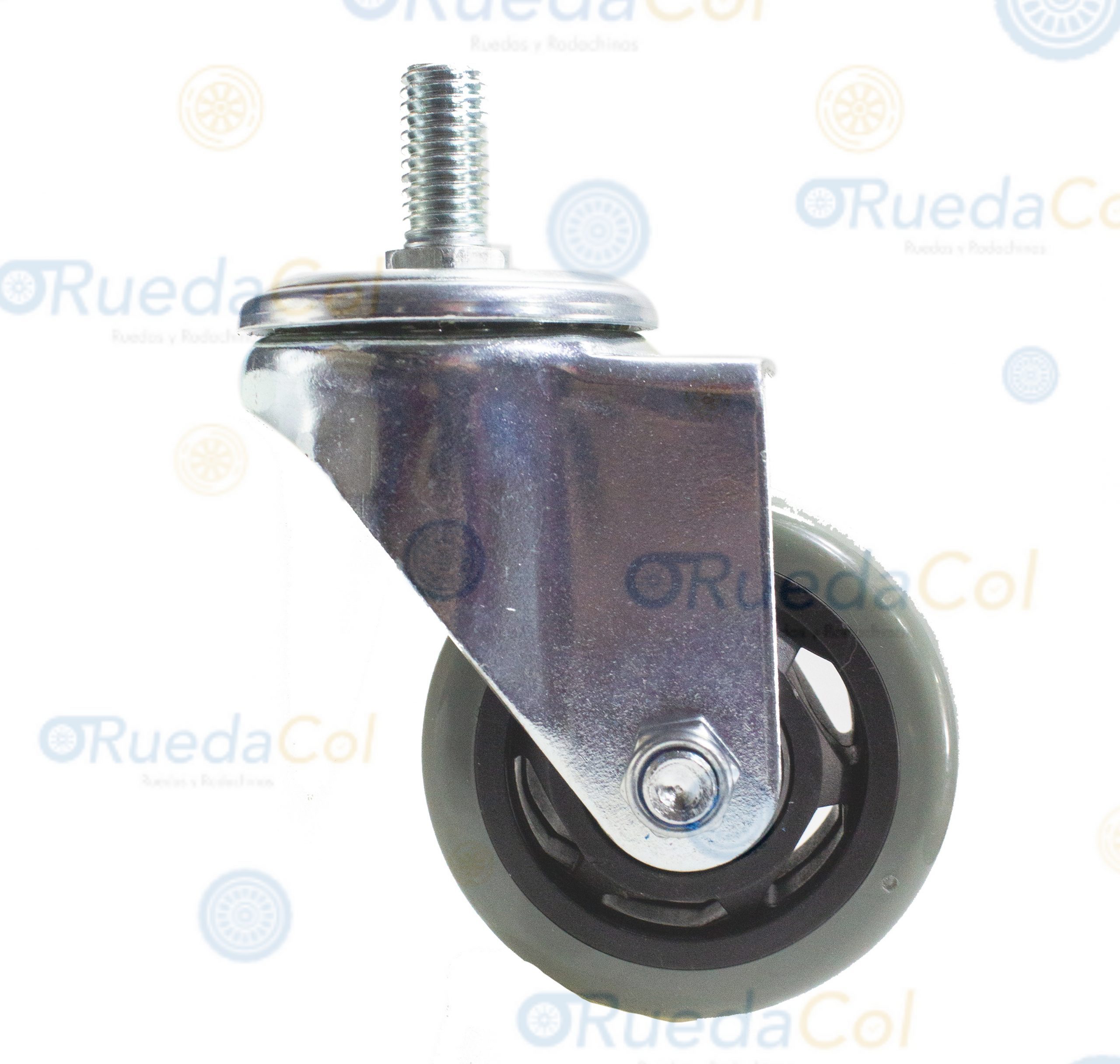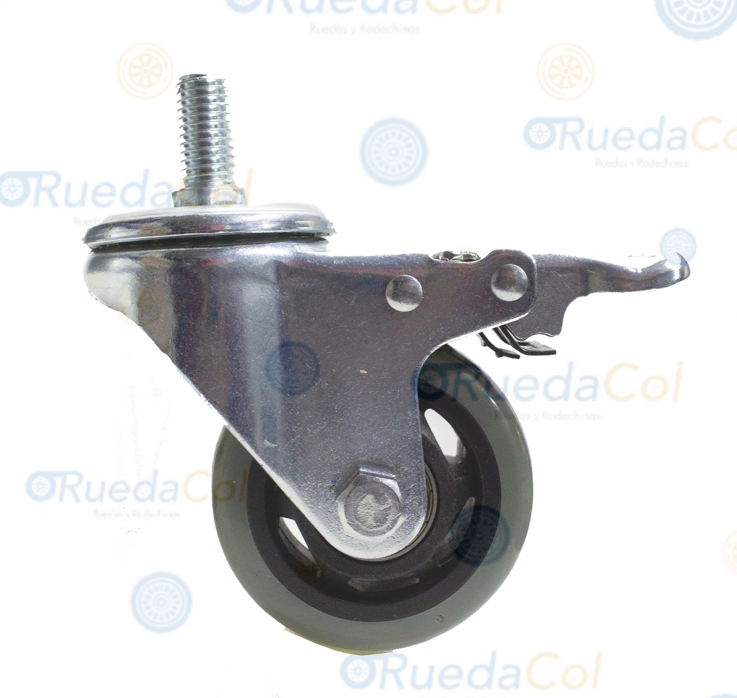 Rueda polvinil en color gris y doble balinera, con o sin freno. Tenedor en lámina de acero galvanizado con tornillo 3/8 y 1/2 desde 1 1/2″ hasta 5″