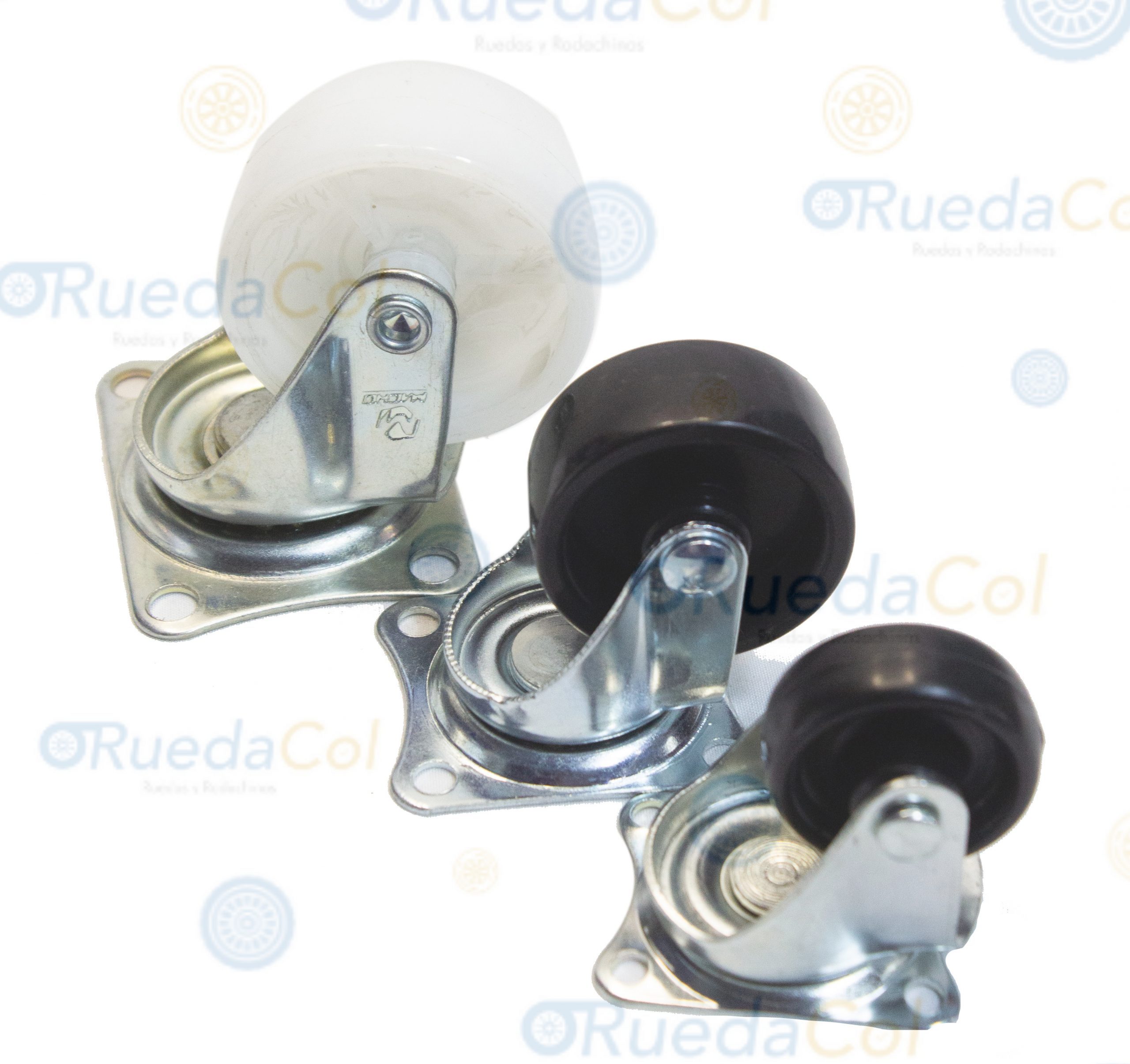 Ruedas giratorias en polipropileno con plataforma. Uso en vitrinas y muebles en madera. Disponibles desde 1″ hasta 2″ .