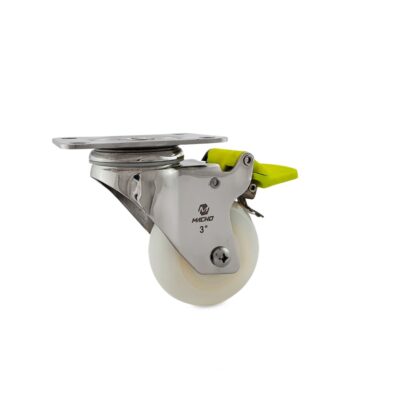 Rodachina con tenedor en acero inoxídable y rueda en Nylon. Ideal para superfícies húmedas, y ambientes expuestos a agentes químicos. Disponible fija, giratoria, con o sin freno. Desde 2″ hasta 6″.