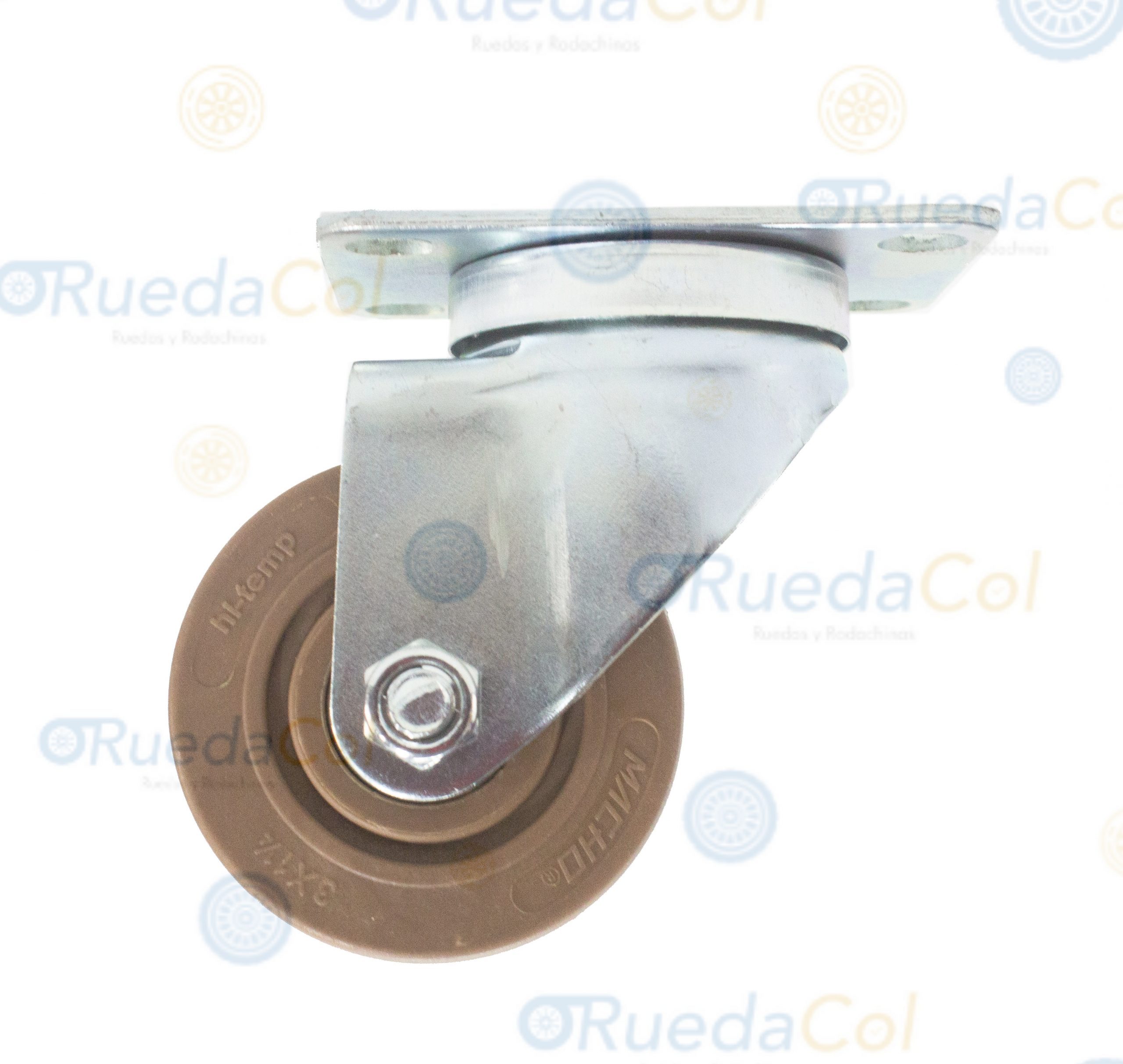 Rodachina con tenedor en acero galvanizado y doble pista de esferas, rueda en poliamida fibra de vidrio. Ideal para 280ºC de temperatura continua por 20 minutos. Uso especial en hornos de panadería. Giratorias con o sin freno. Desde 3″ hasta 4″ .