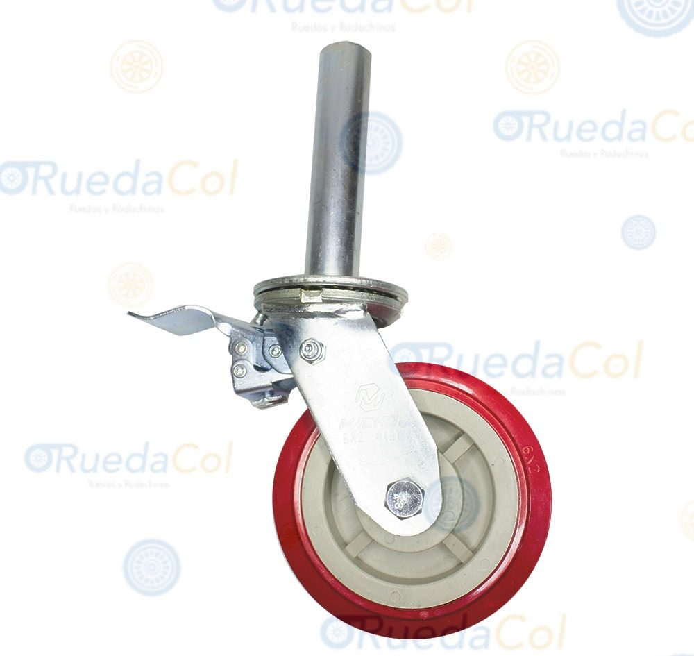 Rueda en polivinil con tenedor en acero galvanizado giratorio. Espigo en tubo 1″ 1/4 con freno. Uso ideal para andamios y construcción.